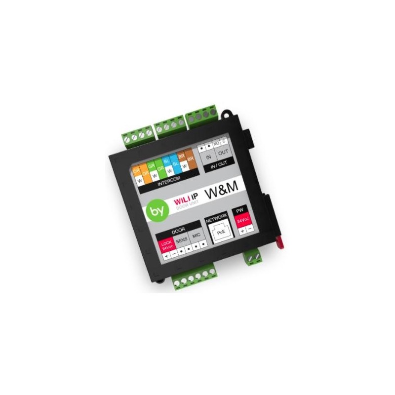 ligação ao intercomunicador de video w&m e á fonte de alimentação, sensor magnético de porta, fechadura electromagnética e com uma entrada e 1 saída digital. i/o.